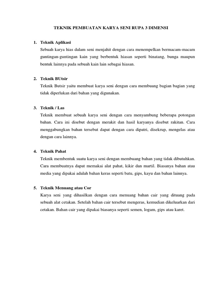 Selain keindahan, karya seni arsitektur juga memperhatikan keseimbangan, kekokohan dan Adalah rancangan, persiapan atau sket sebagai bentuk gambaran kasar yang dikerjakan sewaktu akan melukis atau mmebentuk patung. Beragam karya kerajinan dari bahan lunak buatan dapat dibuat berdasarkan bahan yang digunakan. Kali ini saya akan sedikit membahas sesuatu hal yang memiliki nilai keindahan. Secara umum, untuk semua produk gips diperlukan cetakan. Bahan utama pembuatan cetakan adalah silicone rubber, tetapi yang paling gampang dan mudah dicari adalah plastisin atau tanah liat.fungsi kerajinan dari gips biasanya dapat berupa hiasan dinding, mainan, dan sebagainya. Bahan cair yang biasa digunakan terbuat dari semen, karet, logam dan sebagainya. Karya seni rupa tiga dimensi terwujud dari bahan yang beraneka ragam. Bentuk seni seperti patung, lukisan gua, lukisan batu, dan petroglif dari zaman paleolitikum akhir telah ada sejak dari 40.000 tahun yang lalu. 4) arsitektur karya seni arsitektur adalah merancang dan membangun suatu bentuk dari bangunan. Bahan yang digunakan sejenis, misalnya kertas saja, kaca saja, atau keramik saja. Cara ini bisa disebut dengan merakit. Karya seni ini dapat mudah kita jumpai seperti vas bunga, guci dan sebagainya.
